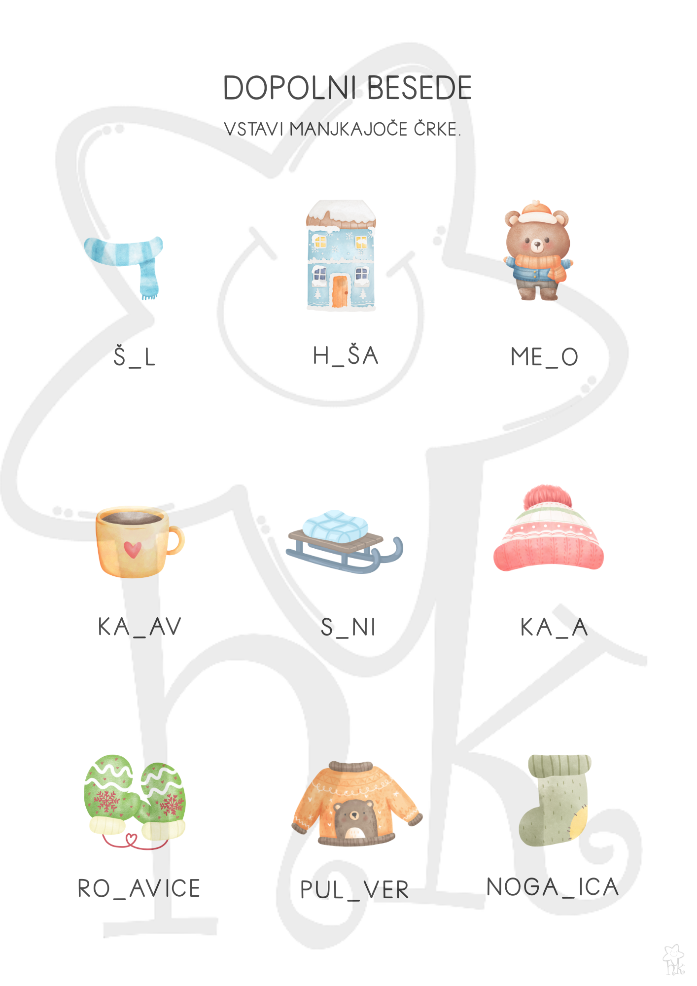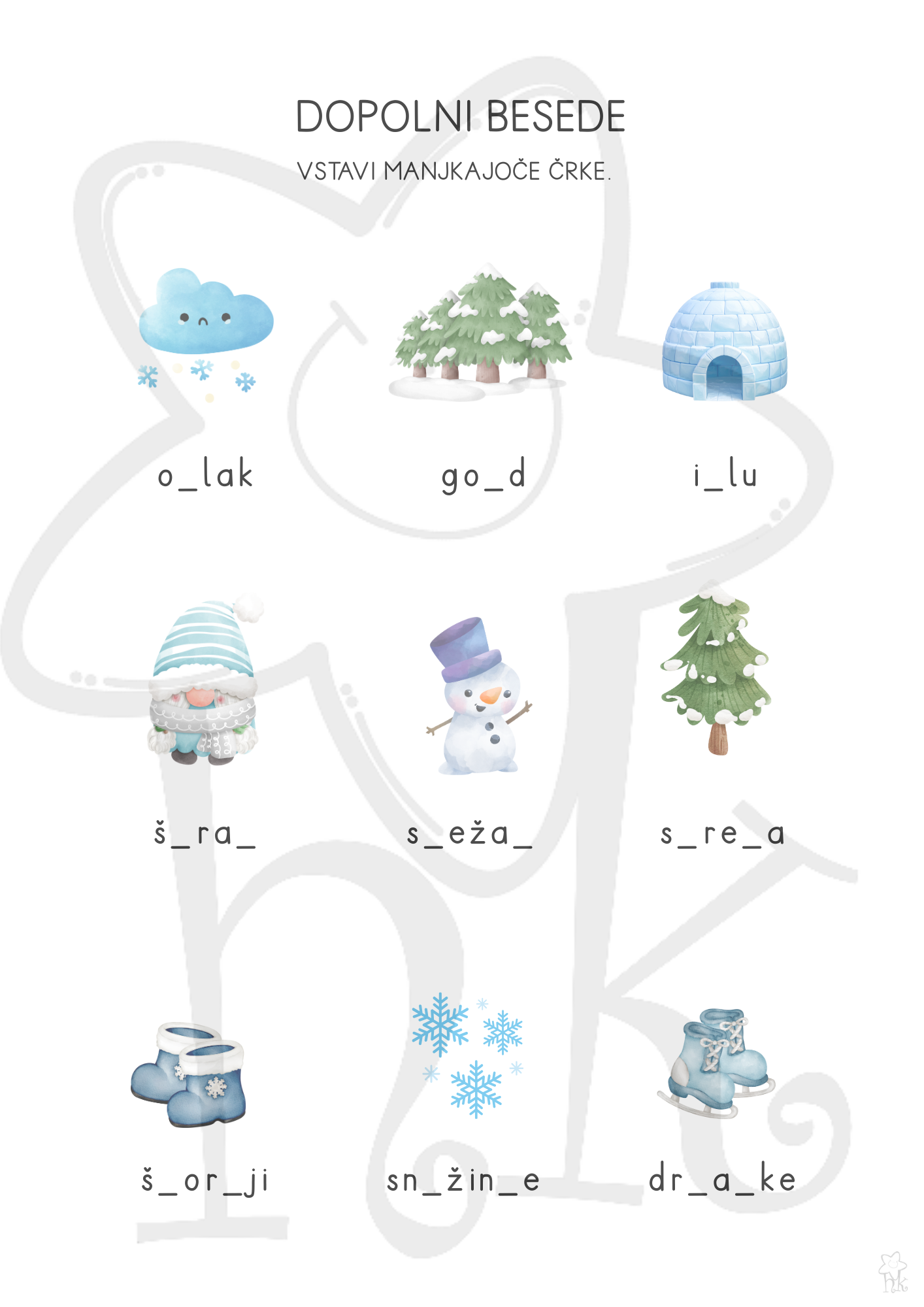 • Zimske črke – igre s tiskanimi in pisanimi črkami za zgodnje opismenjevanje in jezikovni razvoj.